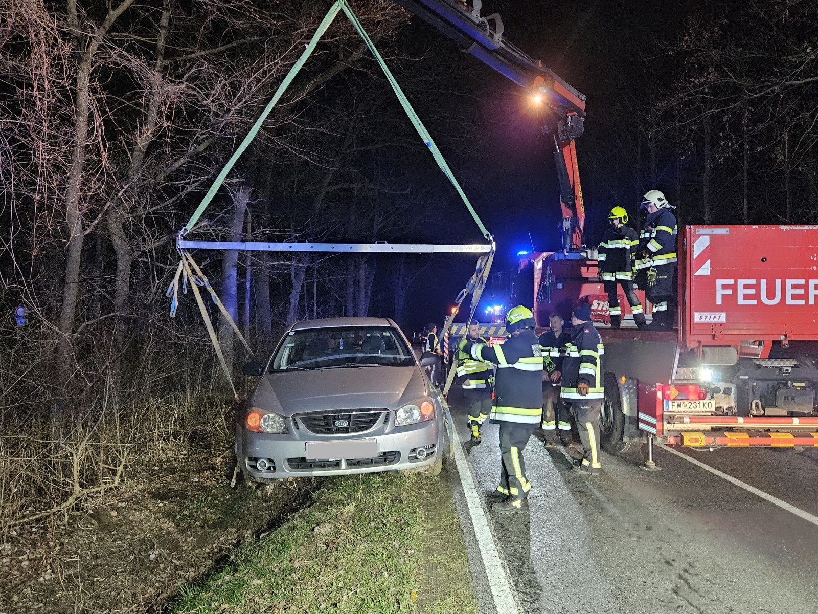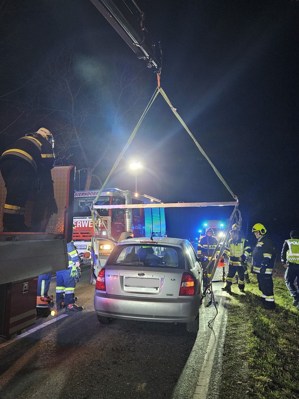 Ein PKW ist aus uns unbekannten Gründen von der Fahrbahn abgekommen und im Straßengraben zu stehen gekommen. Das Fahrzeug wurde mittels Ladekran und Bergetraverse des WLFA-K wieder auf die Straße gehoben und an einem sicheren Ort abgestellt.
