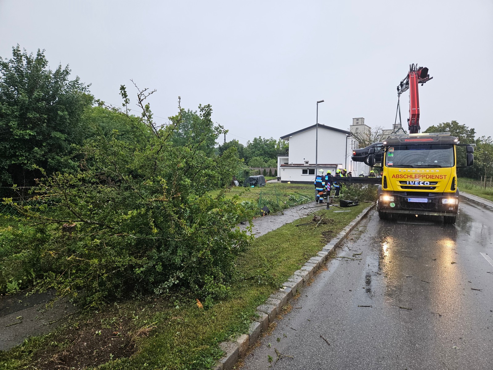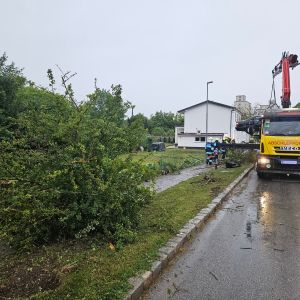 Ein PKW ist aus uns unbekannten Gründen von der Fahrbahn abgekommen, hat zwei kleinere Bäume entwurzelt und ist gegen einen Gartenzaun geprallt. Nachdem bereits ein Abschleppunternehmen das Fahrzeug geborgen hatte bestand unsere Aufgabe darin die Bäume von der Fahrbahn und dem Gehweg zu entfernen.