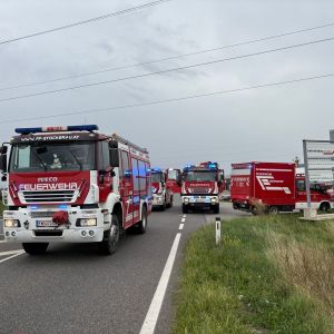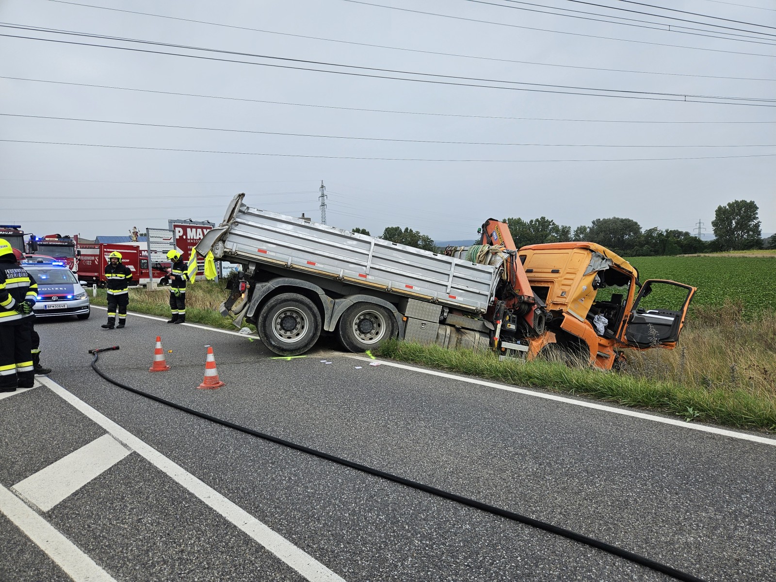 Bei unserem Eintreffen waren Rettungsdienst und Polizei bereits vor Ort. Die offensichtlich nur leicht verletzen Fahrer wurden bereits versorgt. Ein LKW stand in einem Feld neben der Straße, der andere ragte in den Straßengraben. Als Erstmaßnahme bauten wir einen Brandschutz auf.