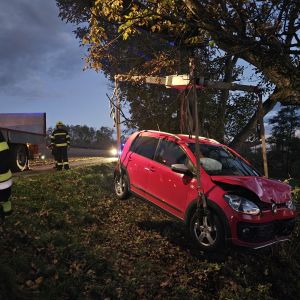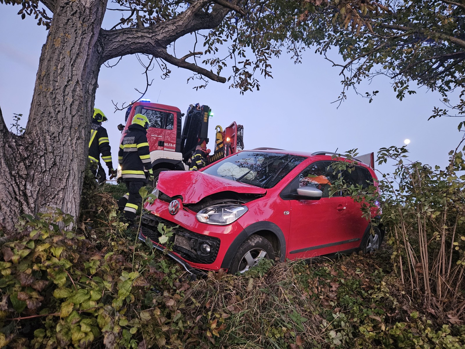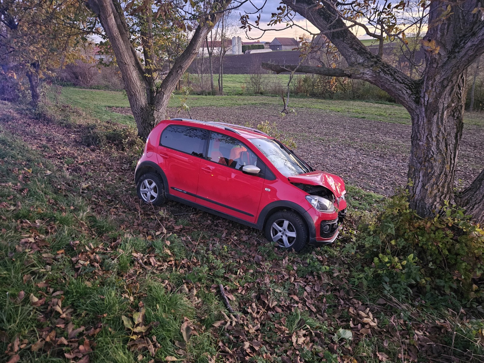 Ein PKW ist aus unbekannter Ursache von der Fahrbahn abgekommen, über die Böschung gerutscht und leicht gegen einen Baum geprallt.
