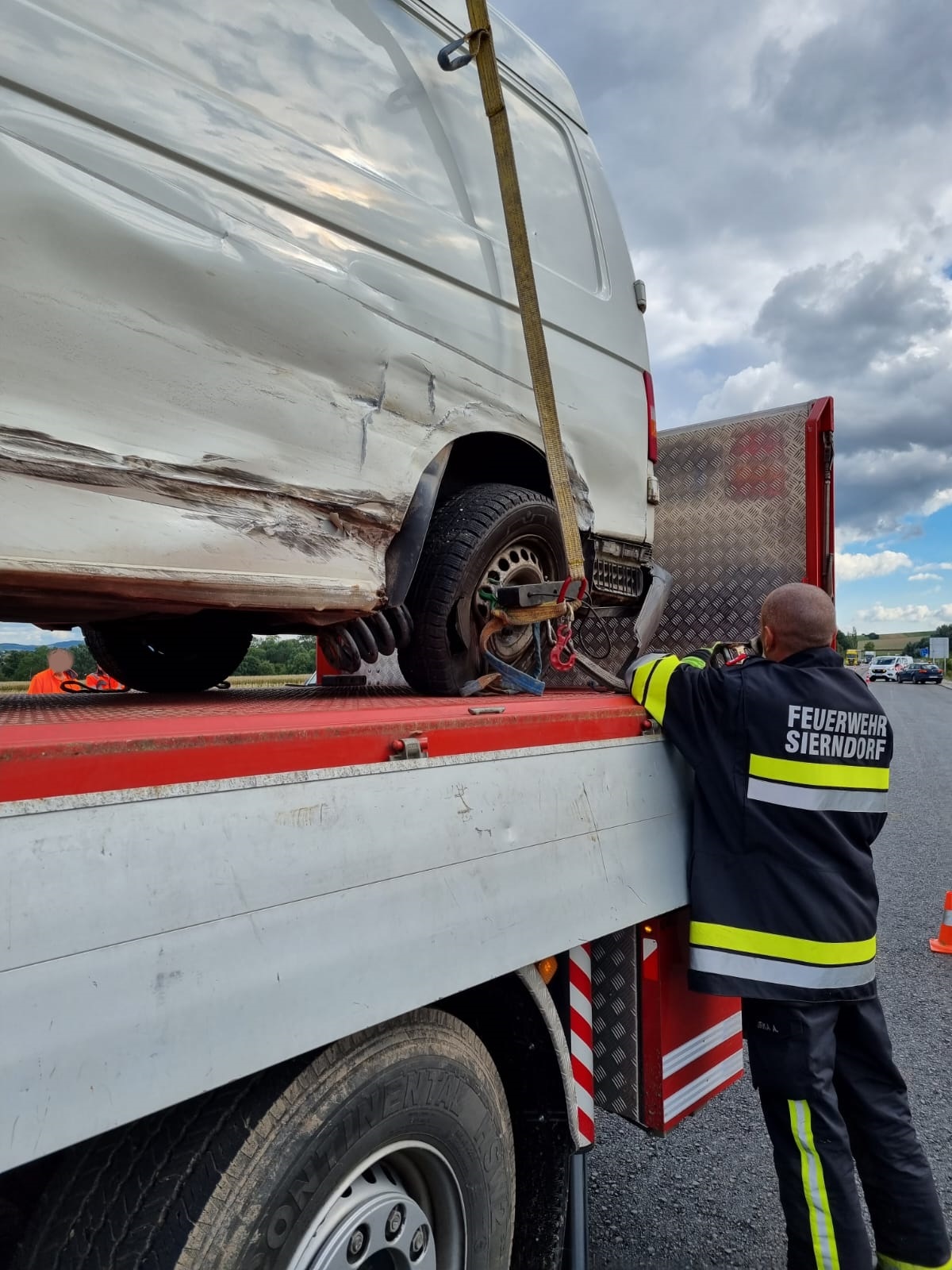 Nach Absicherung der Einsatzstelle und Freigabe durch die Autobahnpolizei wurden beide Fahrzeuge mit dem Hebekreuz des WLFA-K auf das Abschleppplateau verladen und abtransportiert.