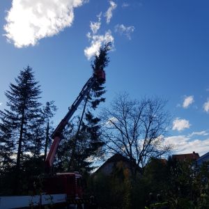 Mit Hilfe des Arbeitskorbes auf dem Ladekran des WLFA-K konnte der Baum stückweise abgetragen werden.