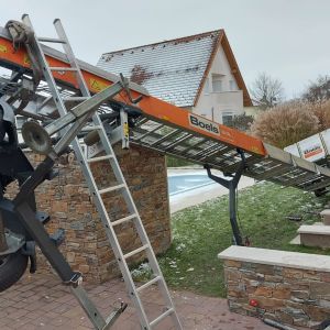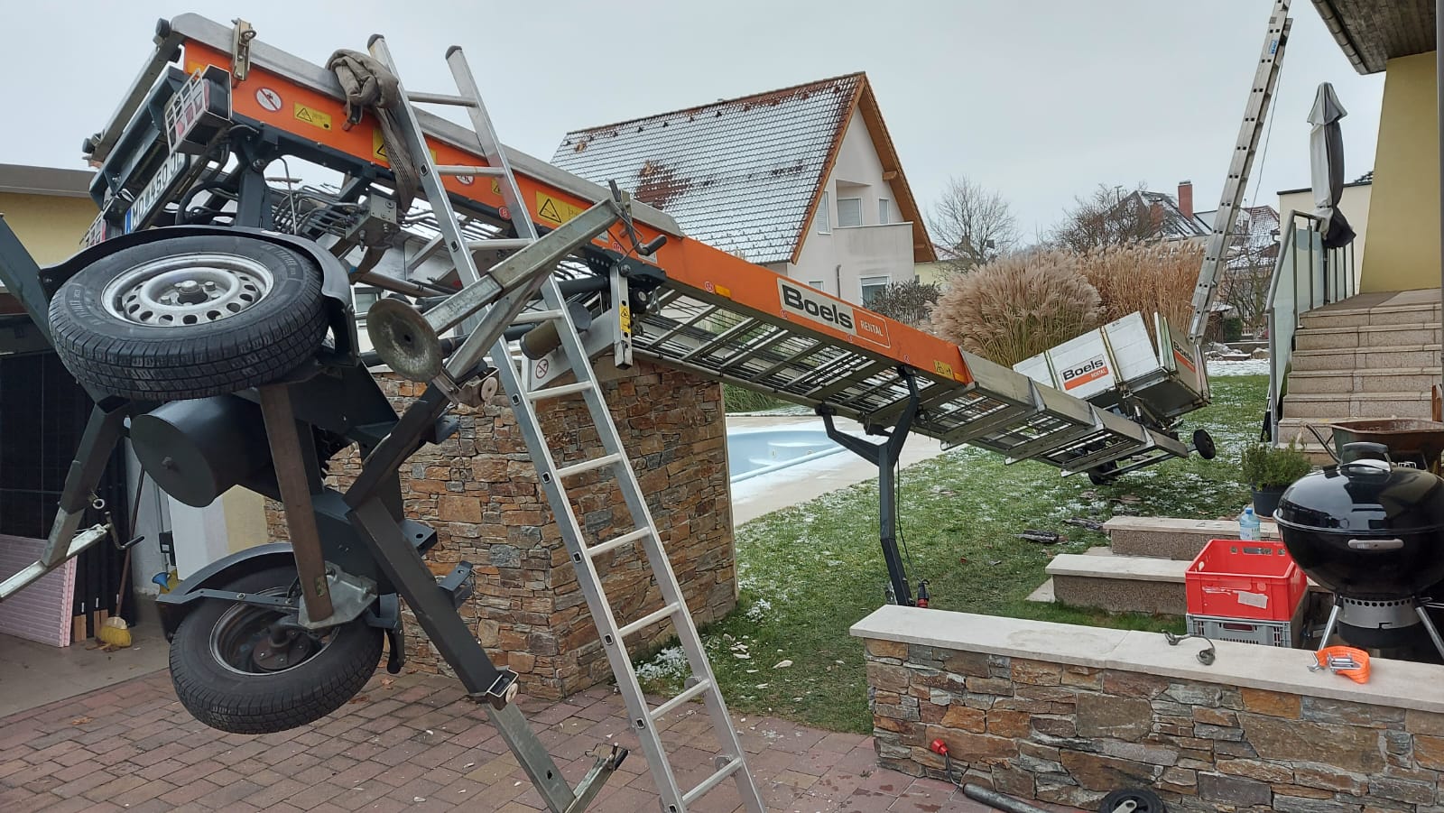 Im Garten eines Einfamilienhauses stürzte ein Schrägaufzug um, welcher für den Materialtransport auf das Dach genutzt wurde.