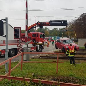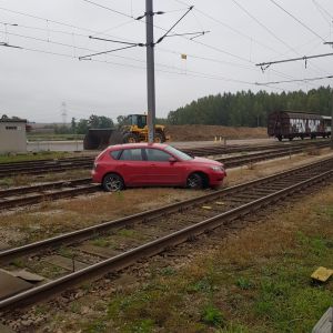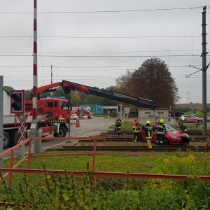 Ein PKW ist aus ungeklärter Ursache von der Fahrbahn abgekommen und kam mit abgerissenem Vorderrad auf den Gleisen bei der Eisenbahnkreuzung zum Stillstand.