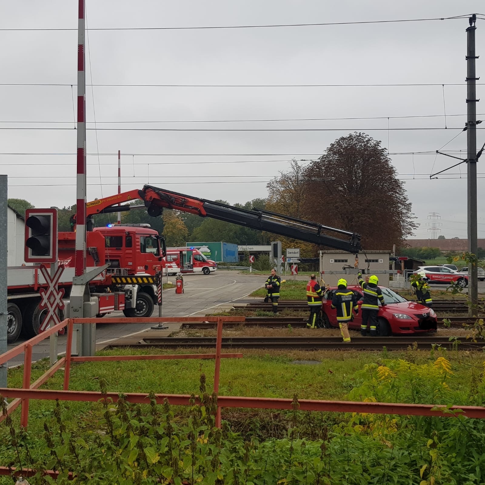 Die FF Sierndorf traf noch vor Polizei und dem Einsatzleiter der ÖBB am Einsatzort an und veranlasste sofort die Sperre der Eisenbahnstrecke. Ein Kamerad, welcher ÖBB-Mitarbeiter ist, bereitete die Abschaltung der Stromoberleitung vor, welche er dann gemeinsam mit dem Einsatzleiter der ÖBB durchführte.