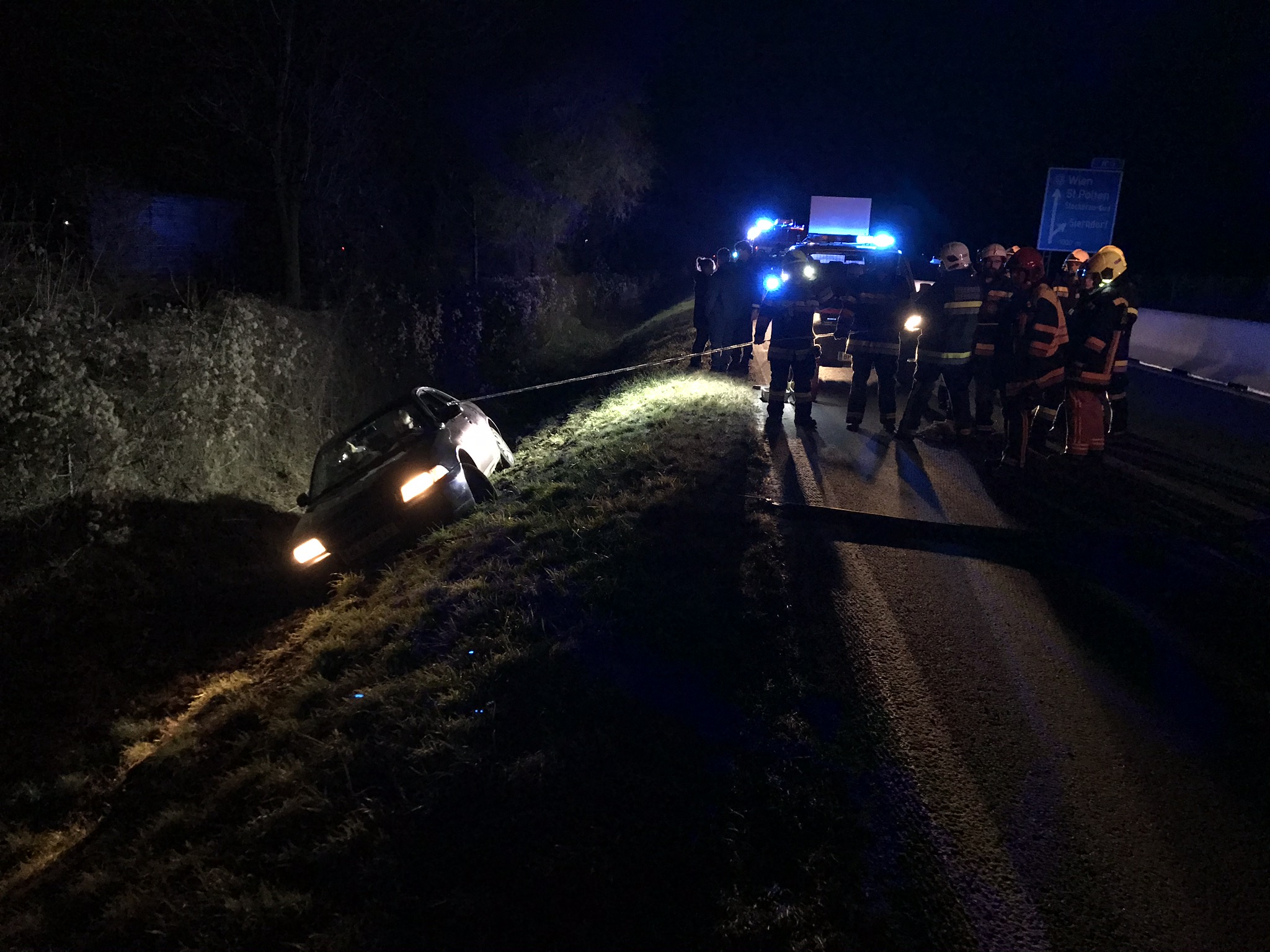 Auf der S3, Richtungsfahrbahn Hollabrunn, zwischen Sierndorf und Obermallebarn kam ein PKW aus ungeklärter Ursache von der Fahrbahn ab. Zum Glück wurde dabei niemand verletzt, eine gehbehinderte Person auf dem Beifahrersitz konnte den PKW allerdings nicht verlassen. Daher war bei der Bergung des PKW aus dem Graben besondere Vorsicht geboten. Mittels RLFA-2000 konnte der PKW geborgen und zur nächsten Pannenbucht geschleppt werden.