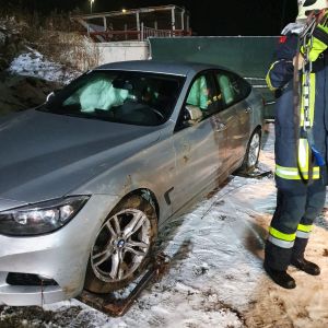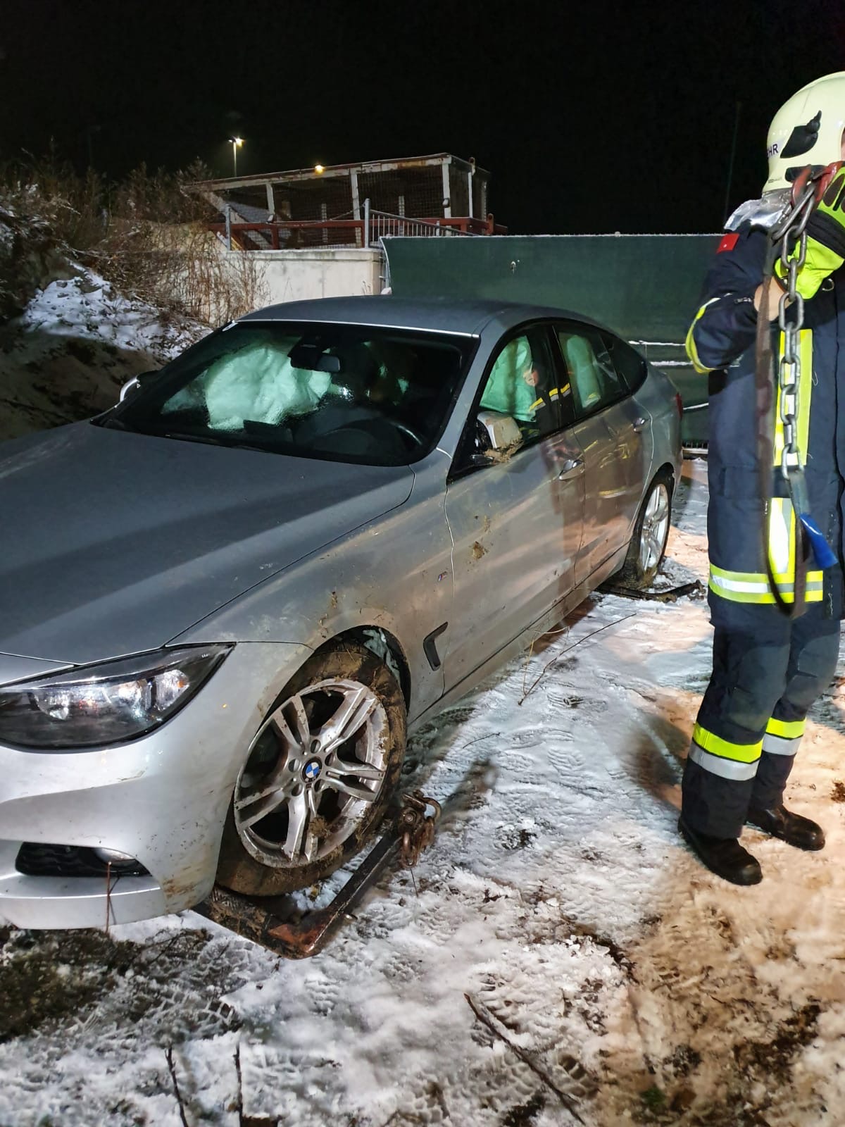 Beim Schloß Schönborn kam ein PKW aufgrund der rutschigen Fahrbahn von der Straße ab und rutschte seitlich in den Straßengraben. Der PKW wurde dabei nur minimal beschädigt, dennoch lösten die Airbags aus und das Fahrzeug ließ sich nicht mehr starten. Aufgrund des blockierenden Automatikgetriebes war eine Bergung mittels Seilwinde nicht möglich und der PKW wurde mit dem Hebekreuz des WLFA-K aus dem Straßengraben gehoben und abtransportiert.