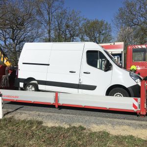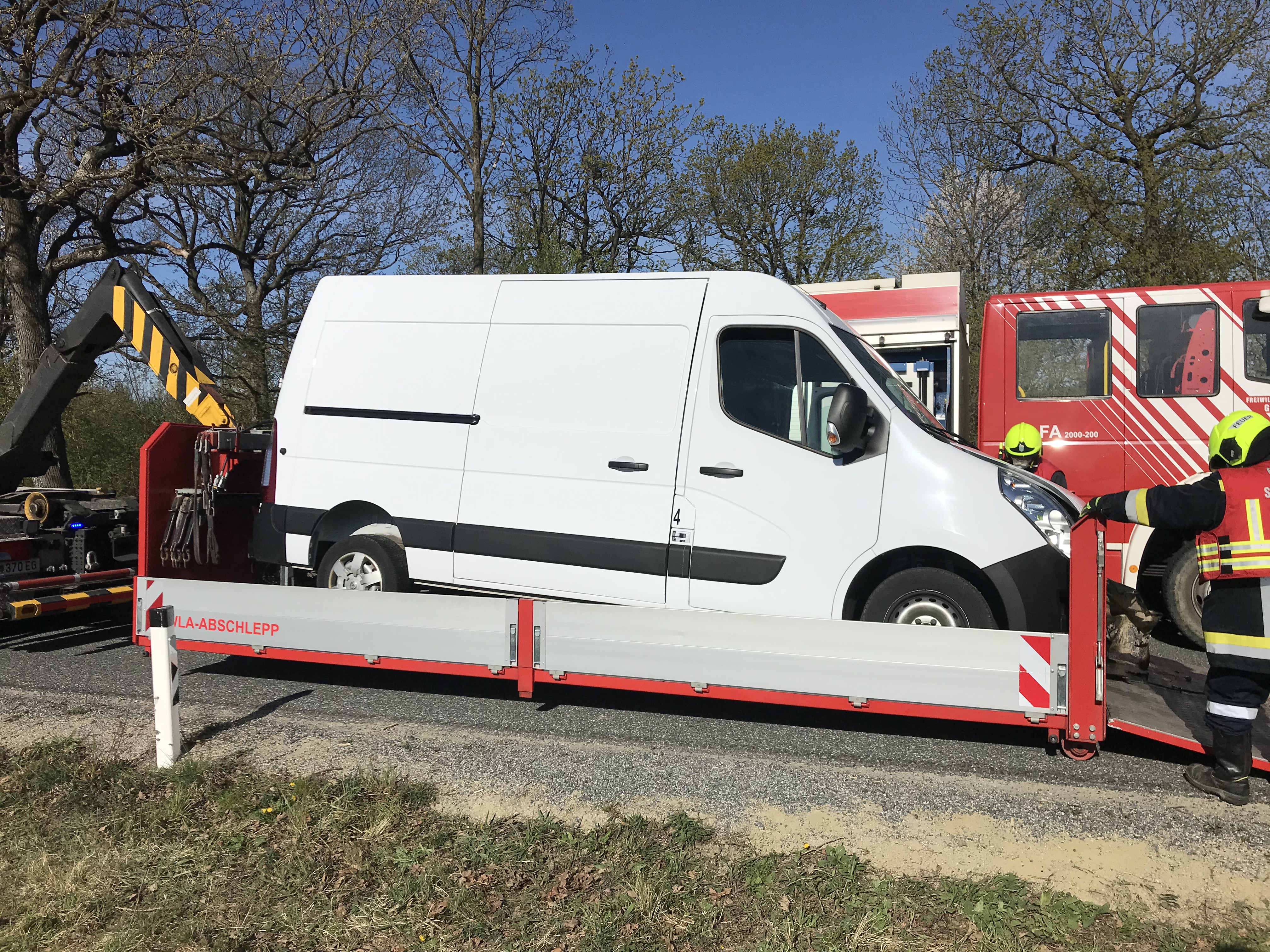 Somit beschränkten sich unsere Tätigkeiten auf den Abtransport der verunfallten Fahrzeuge. Der Kastenwagen wurde mittels Seilwinde auf das Plateau des WLFA-K gezogen, der PKW wurde mit dem Ladekran auf einen Anhänger der FF Großmugl gehoben.