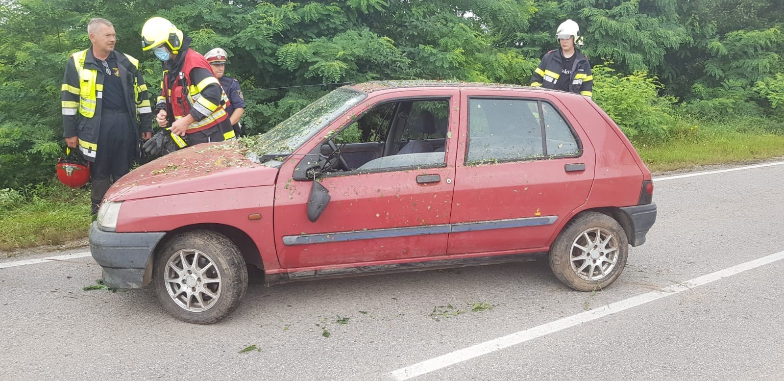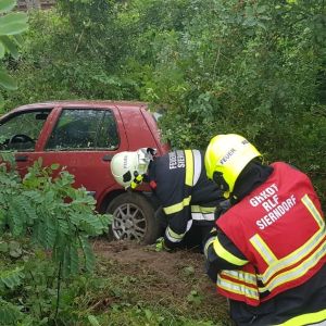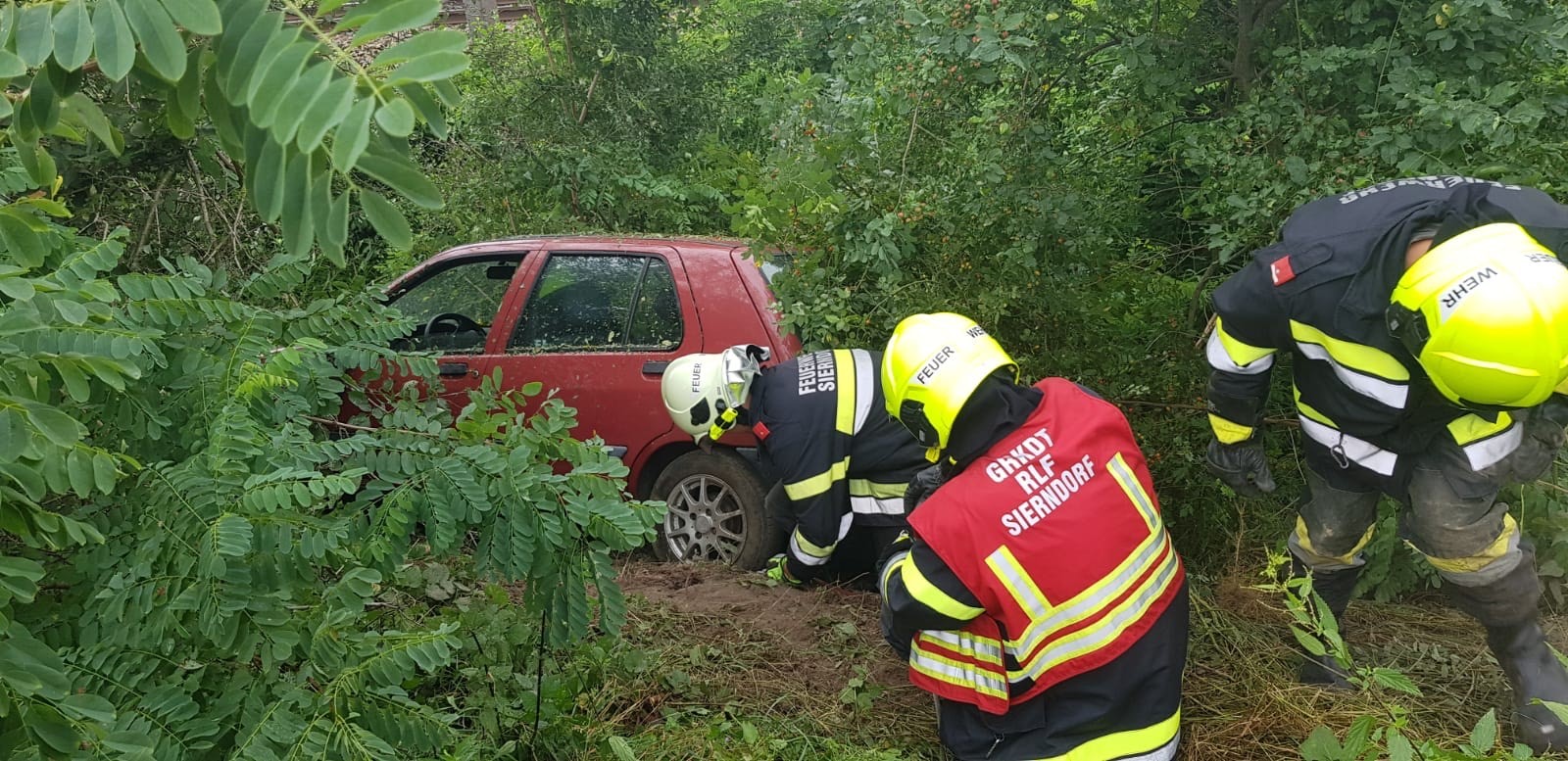 Vor der Bergung mittels Seilwinde des RLFA-2000 musste das Gestrüpp mit der Motorsäge entfernt werden. Der PKW wurde anschließend auf das Abschleppplateau des WLFA-K verladen und abtransportiert.