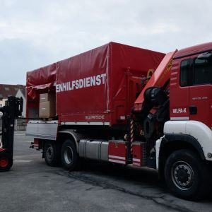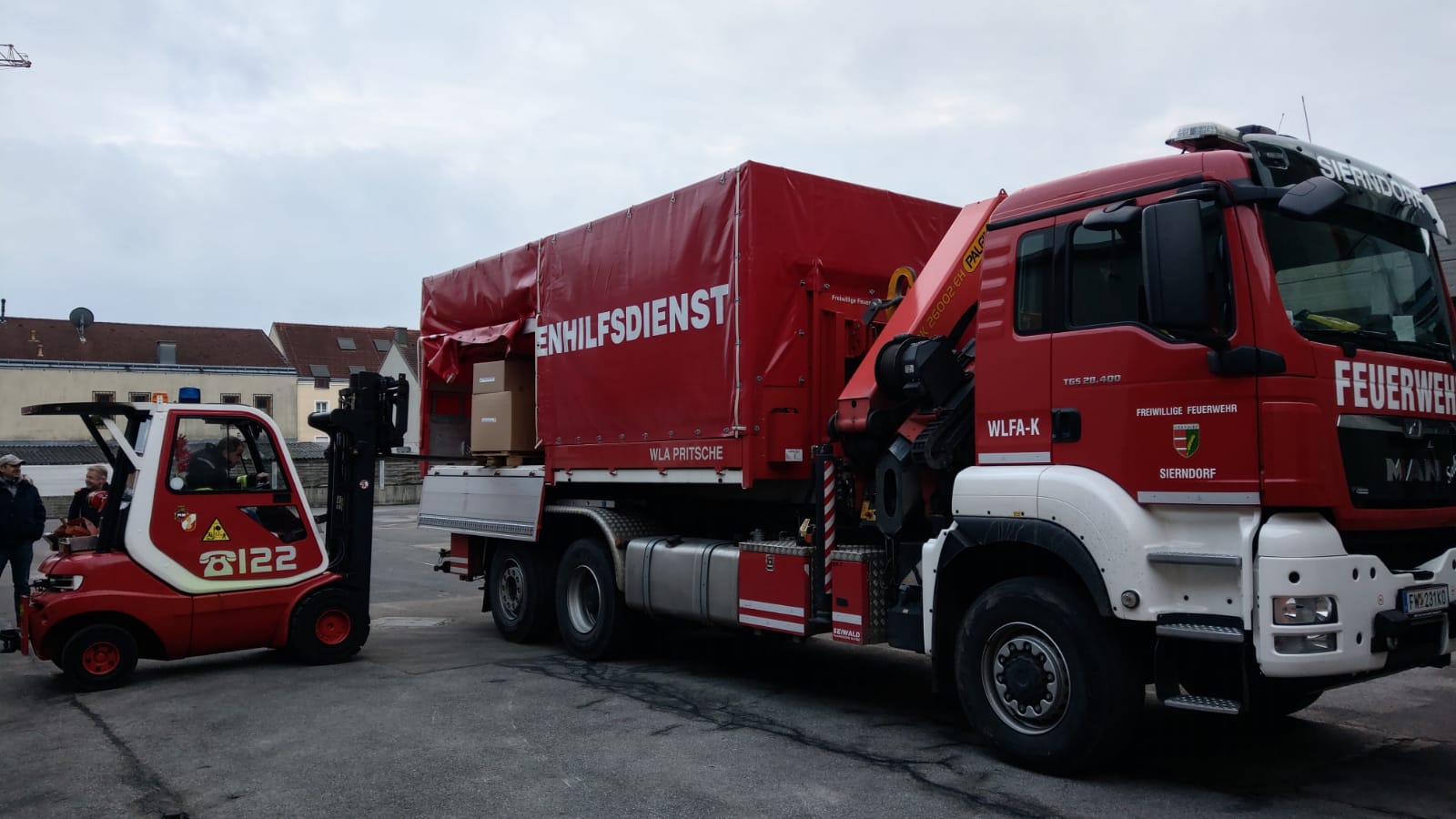Für den Bezirk Korneuburg wurden drei Wechselladefahrzeuge, darunter das WLFA-K Sierndorf, und ein Versorgungsfahrzeug zum Containerterminal des NÖ Landesfeuerwehrverbandes nach Tulln entsendet um mehrere Paletten mit Schutzausrüstung abzuholen.