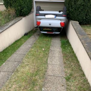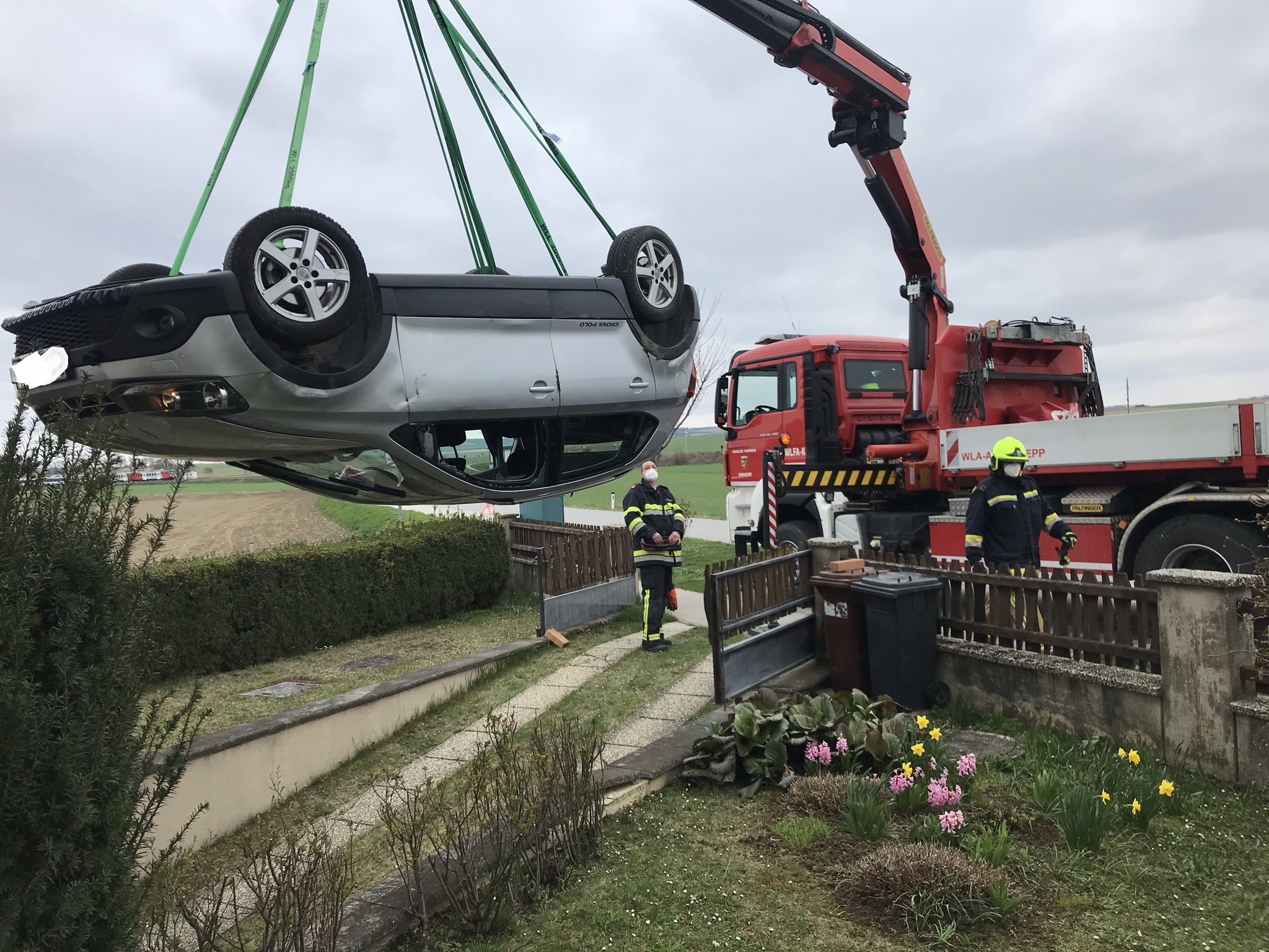 Der PKW wurde aus der Einfahrt gehoben, auf der Straße wieder auf die Räder gestellt und abtransportiert.