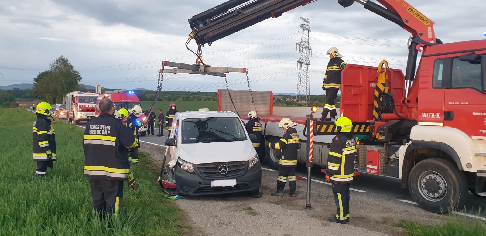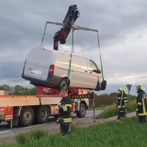 Nach Absicherung der unübersichtlichen Einsatzstelle wurde der Kastenwagen mittels Hebekreuz auf das Abschleppplateau des WLFA-K verladen und abtransportiert.
