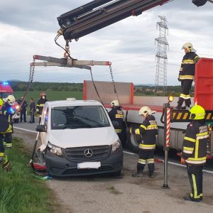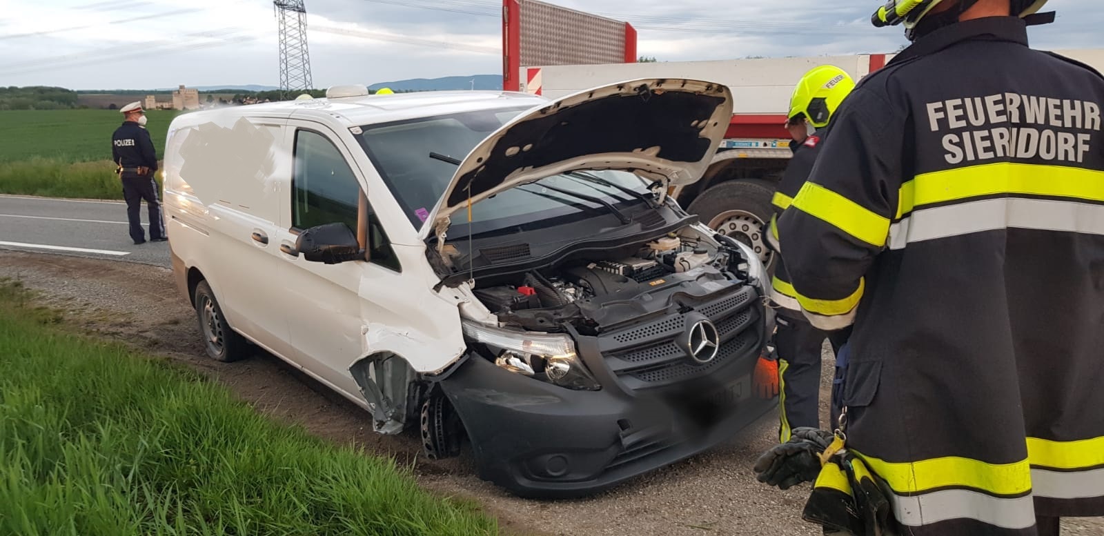 Auf der L1132 zwischen dem Kreisverkehr bei der S3 und Unterhautzental kam ein Kastenwagen nach einem vorhergehenden Unfall mit ausgerissenem rechtem Vorderrad zum Liegen.
