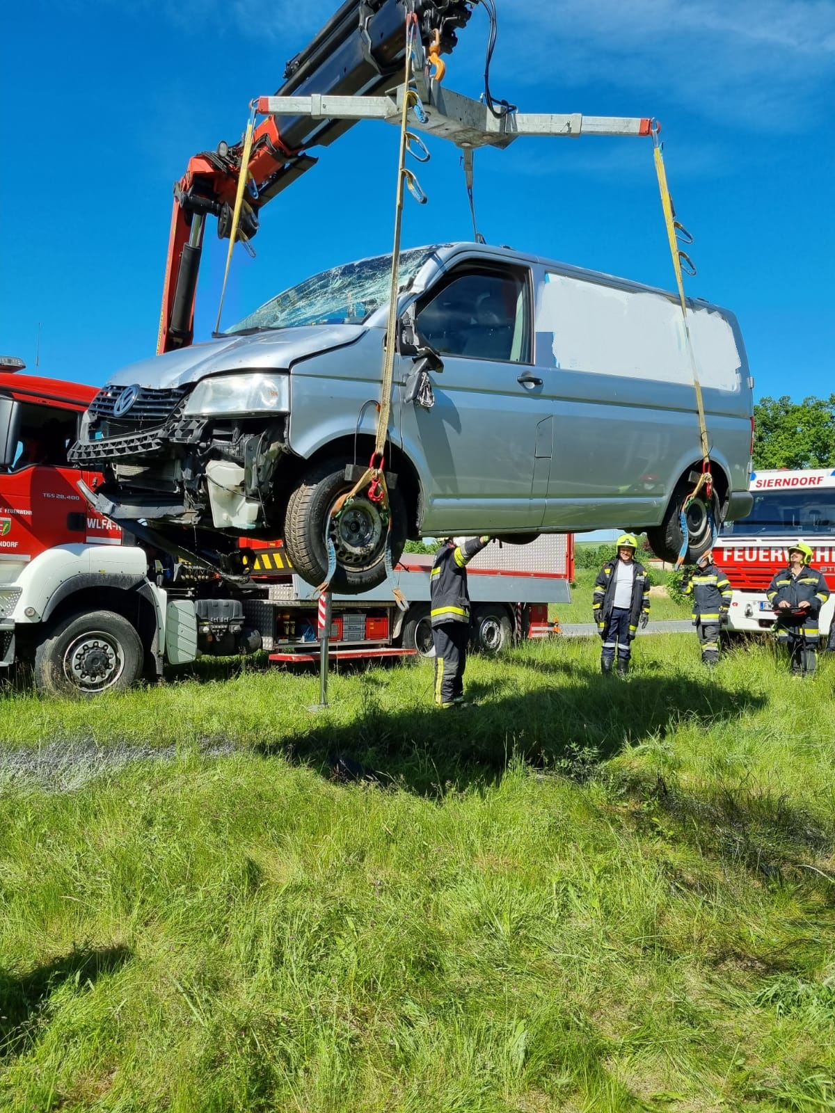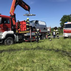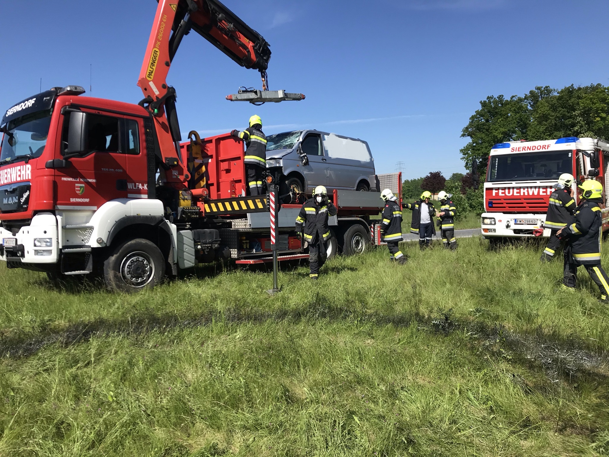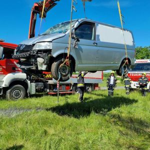 Nach Absicherung der Unfallstelle und Freigabe durch die Autobahnpolizei wurde der Kastenwagen mittels Hebekreuz auf das Abschlepp-Plateau des WLFA-K verladen und abtransportiert. Ausgeflossene Betriebsstoffe wurden gebunden.