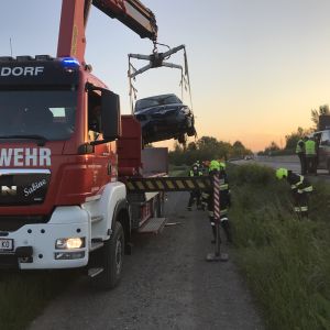 Nach Absicherung der Unfallstelle und Feststellung, dass Betriebsmittel austreten, wurde der PKW mittels Hebekreuz auf das Abschlepp-Plateau des WLFA-K verladen und abtransportiert.
