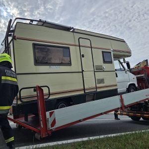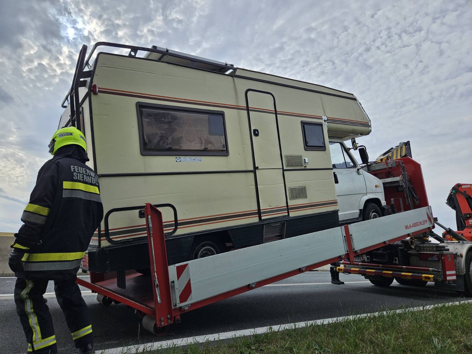 Nach Absicherung der Einsatzstelle, wurde das Wohnmobil auf das Abschleppplateau des WLFA-K gezogen und abtransportiert.