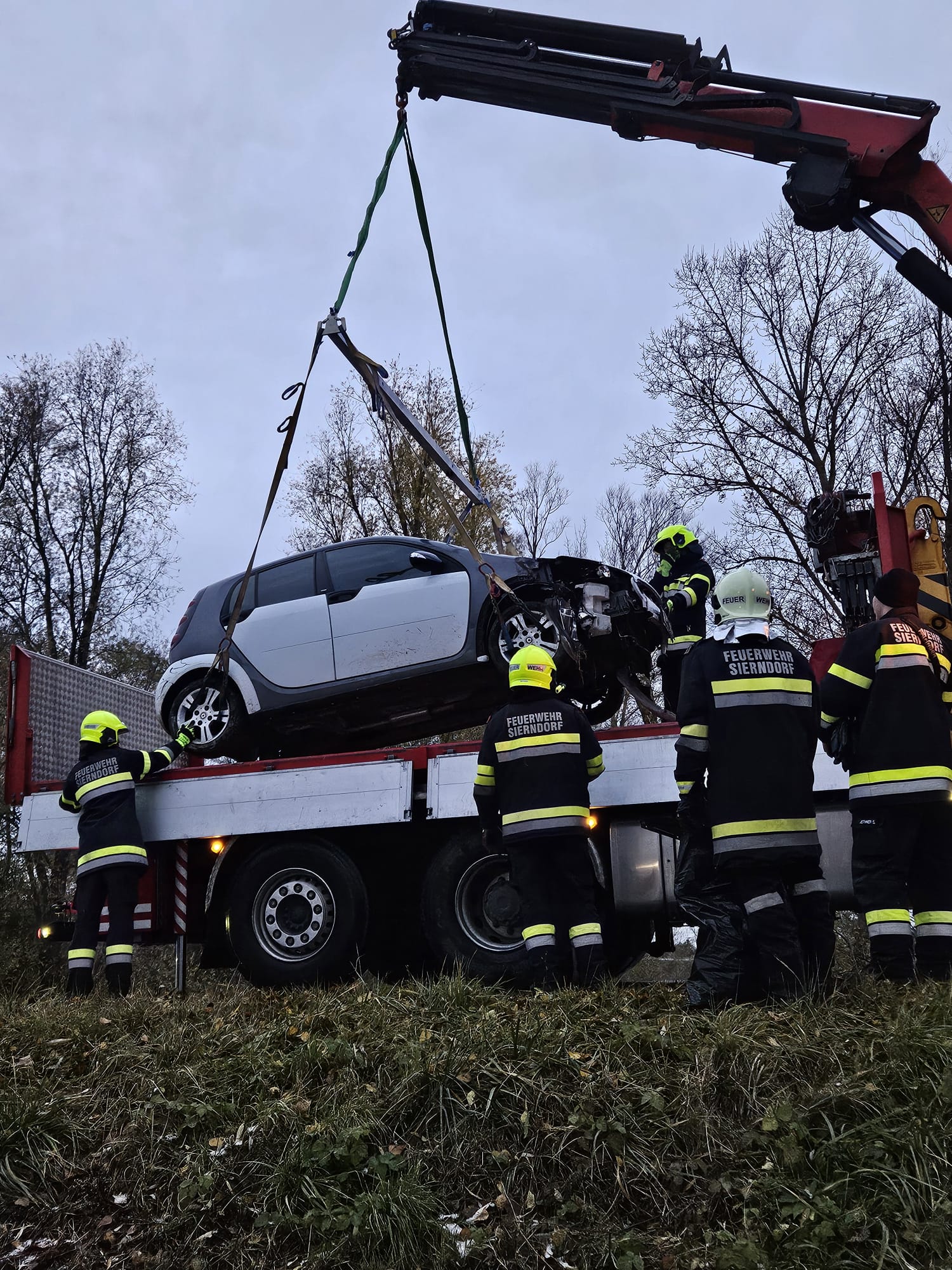 Nach Absicherung der Unfallstelle wurde der PKW mittels Ladekran auf das Abschleppplateau verladen und abtransportiert.
