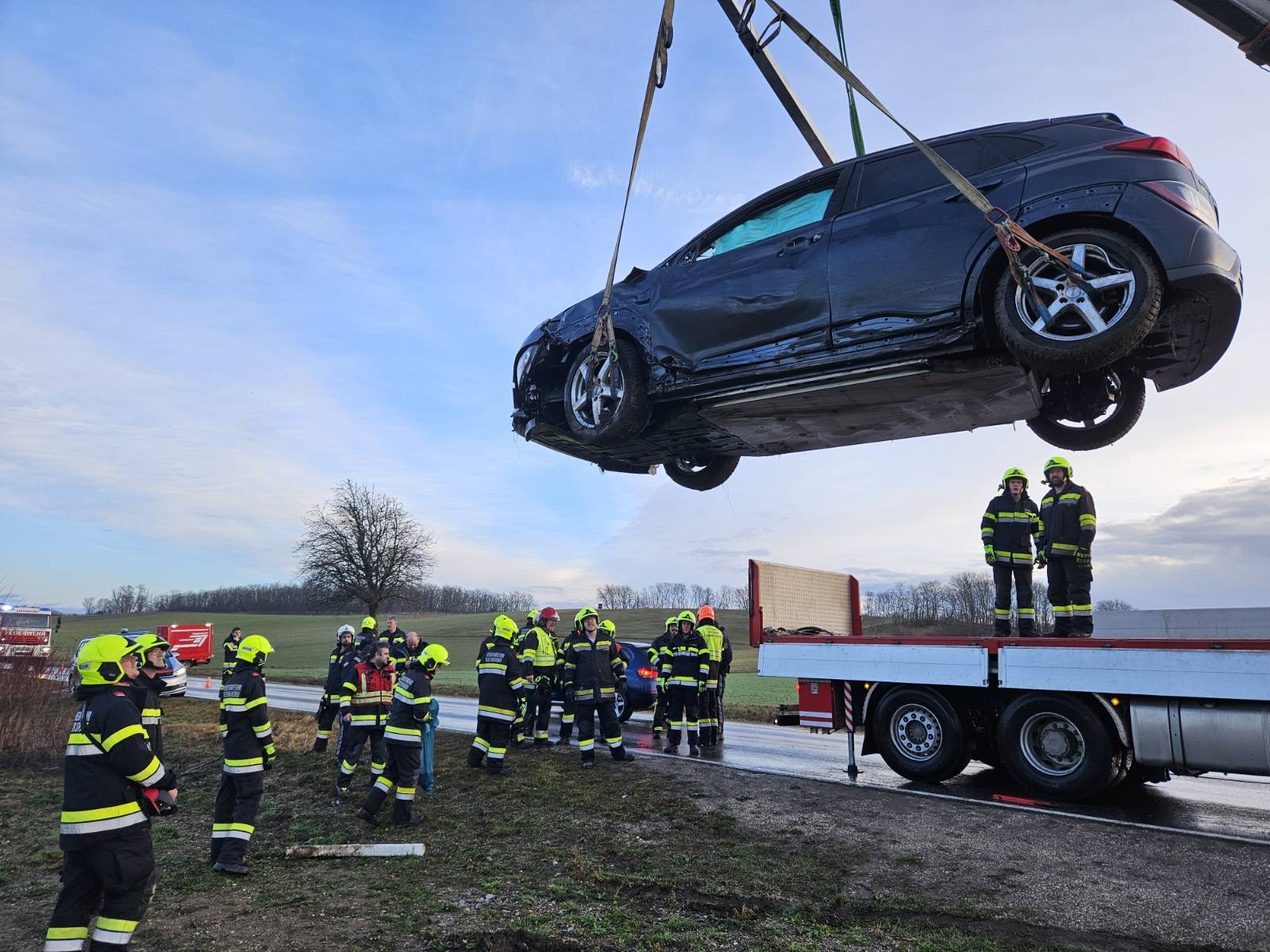 Nach Absicherung der Einsatzstelle wurde der PKW im Auftrag der Polizei mittels Ladekran des WLFA-K verladen und abtransportiert.