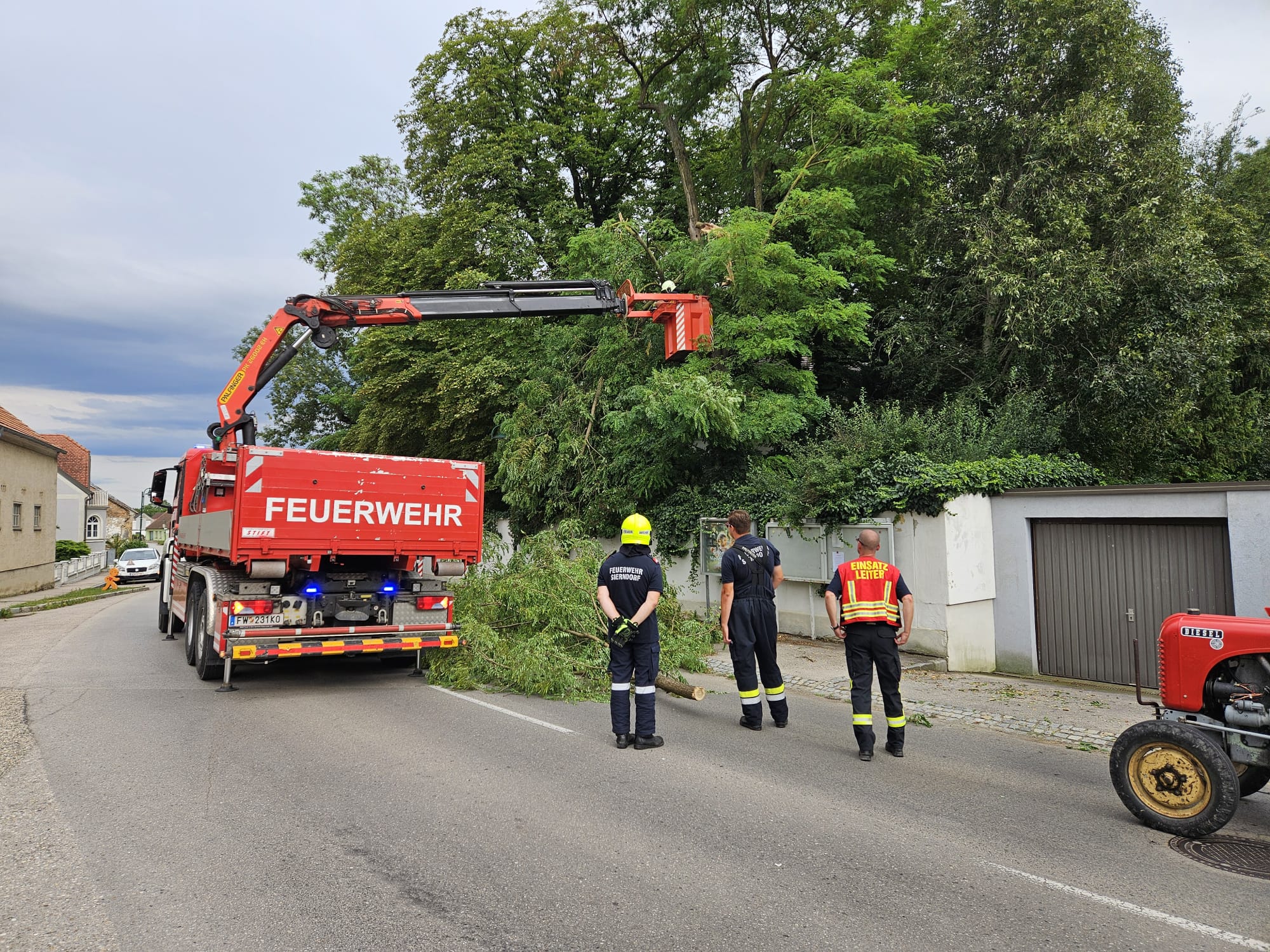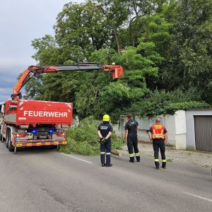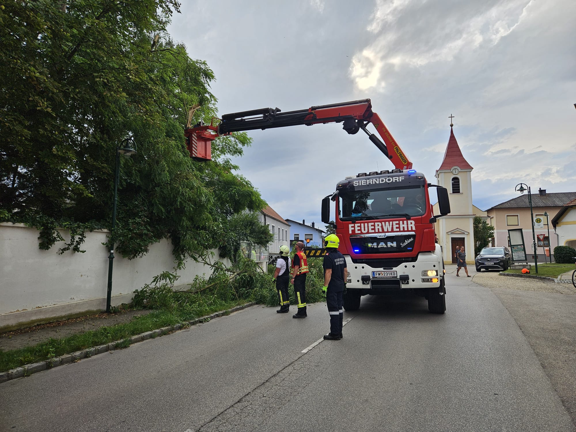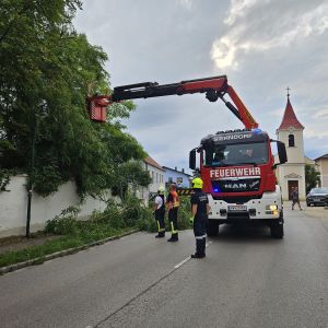 Das WLFA-K mit Arbeitskorb wurde von der FF Hausleiten zur Unterstützung bei der Beseitigung eines Sturmschadens angefordert.