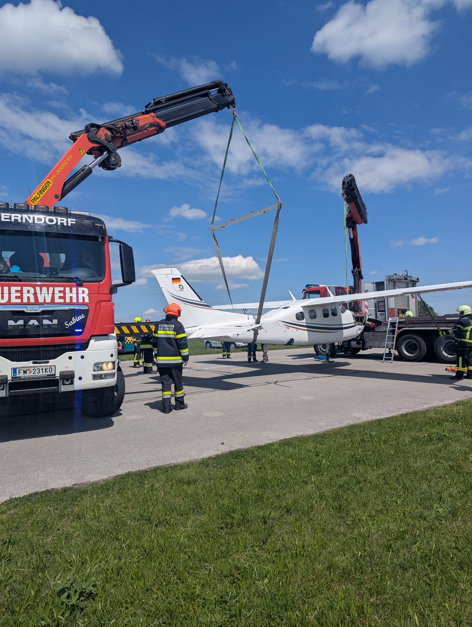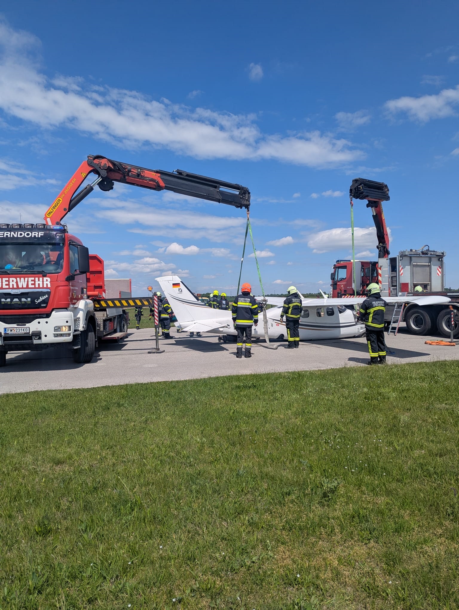 Die FF Stockerau wurde zur Bergung alarmiert und rückte mit drei Fahrzeugen aus. Nach Absprache mit dem Betriebsleiter des Flugplatzes und des Piloten wurde entschieden das Flugzeug an zwei Punkten zu heben um das Fahrwerk ausfahren zu können. Daher wurde vom Einsatzleiter der FF Stockerau das WLFA-K Sierndorf angefordert.