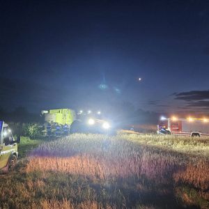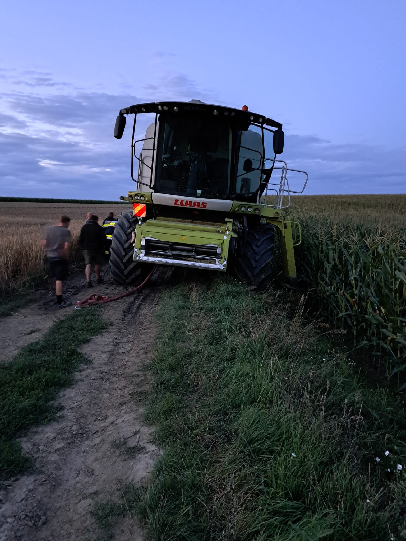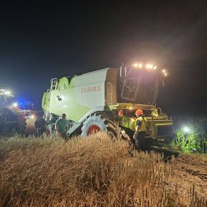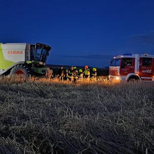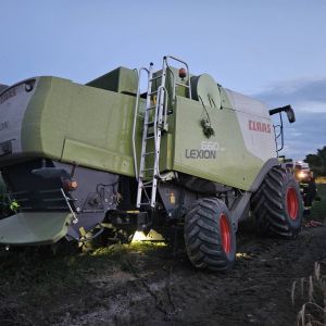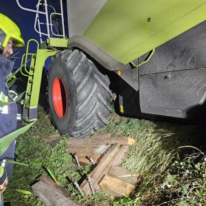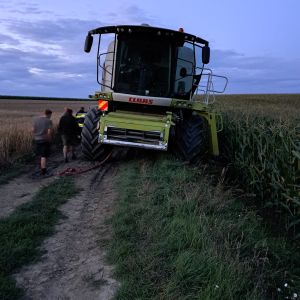 Auf einem Feldweg kam ein Mähdrescher leicht vom Weg ab und drohte weiter in das angrenzende Feld abzurutschen. Da ein Bergungsversuch mit einem Traktor nicht sicher genug war, wurde unsere Hilfe angefordert.