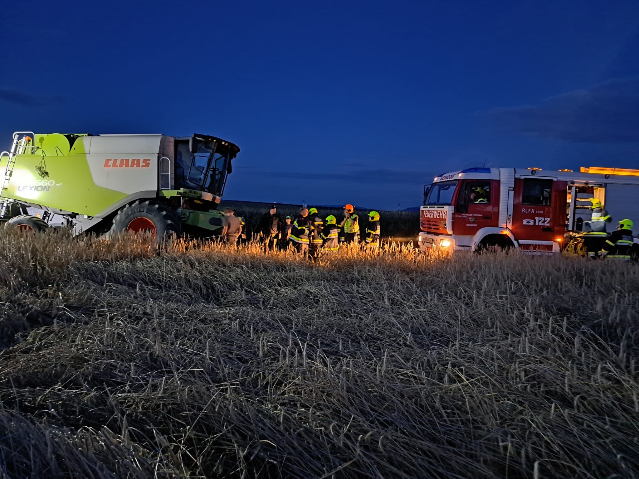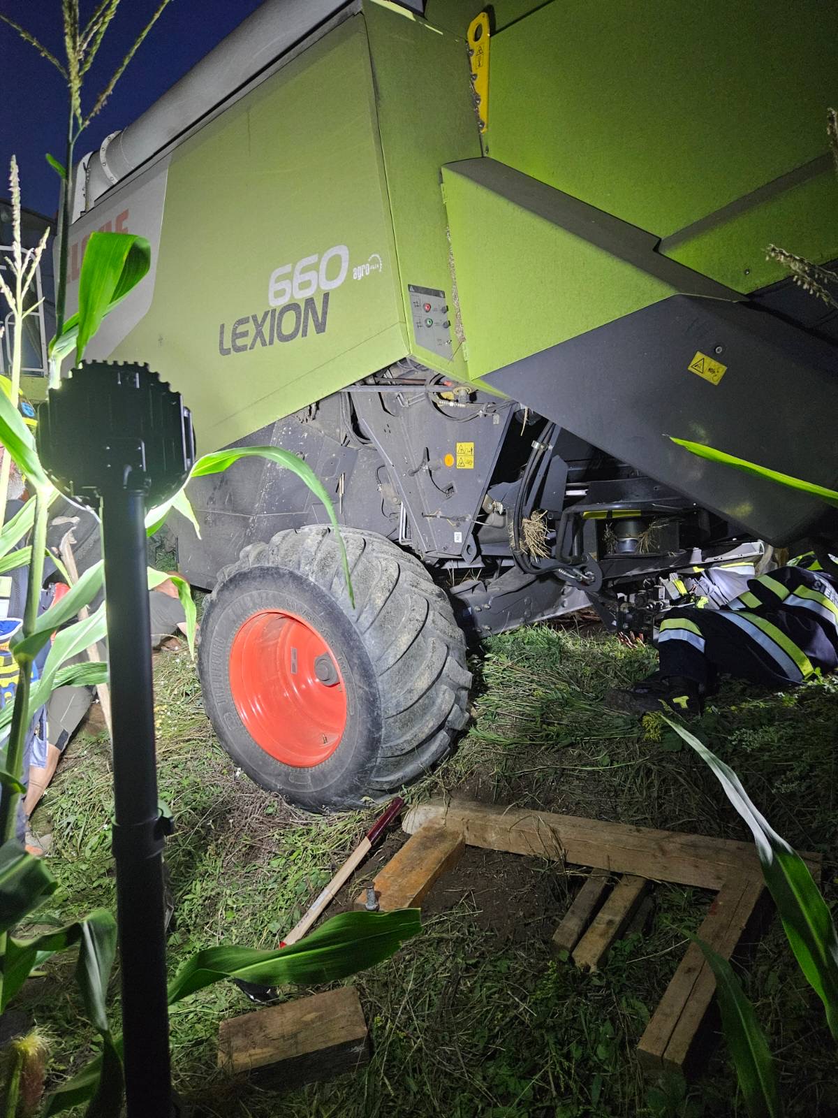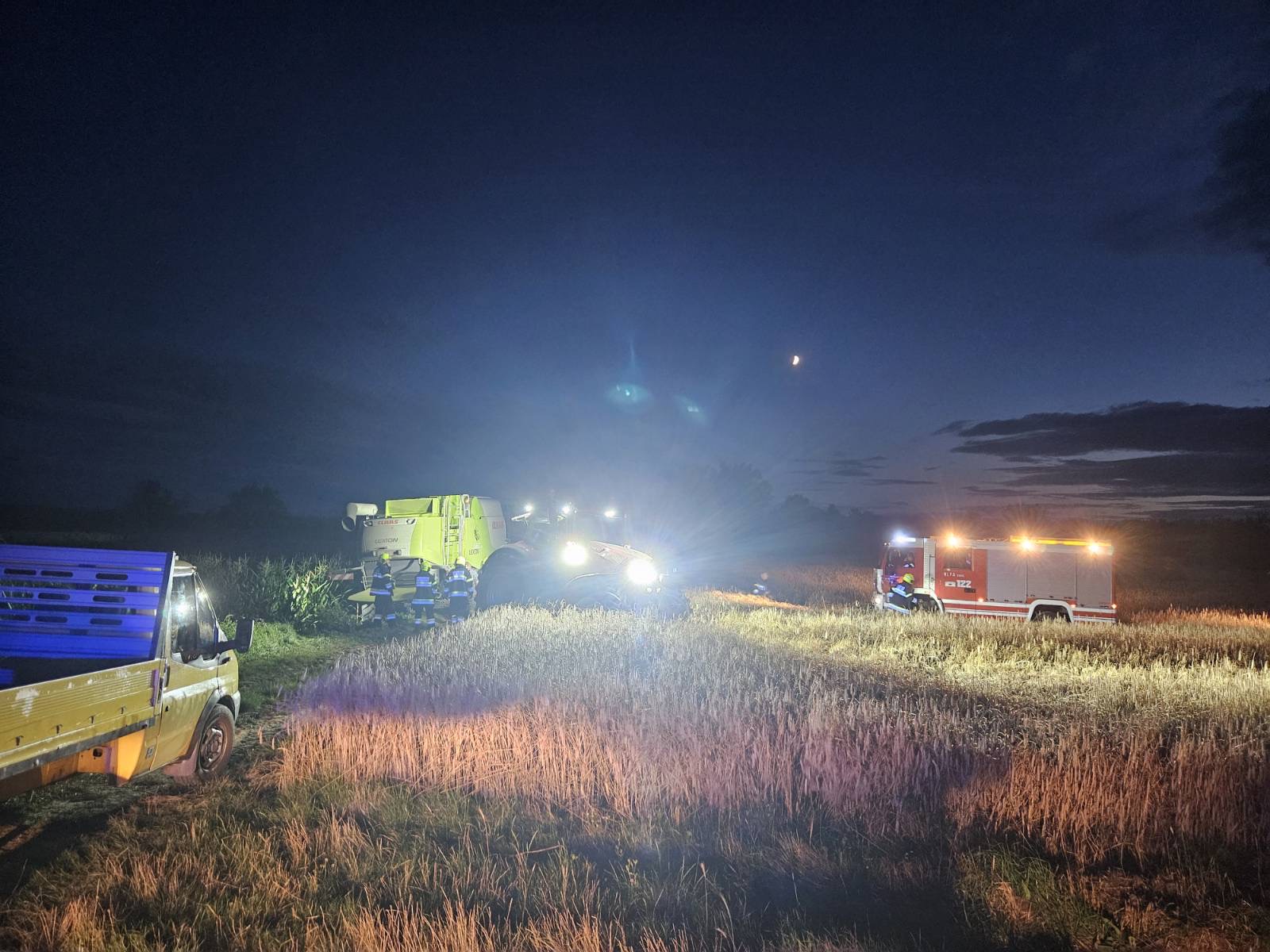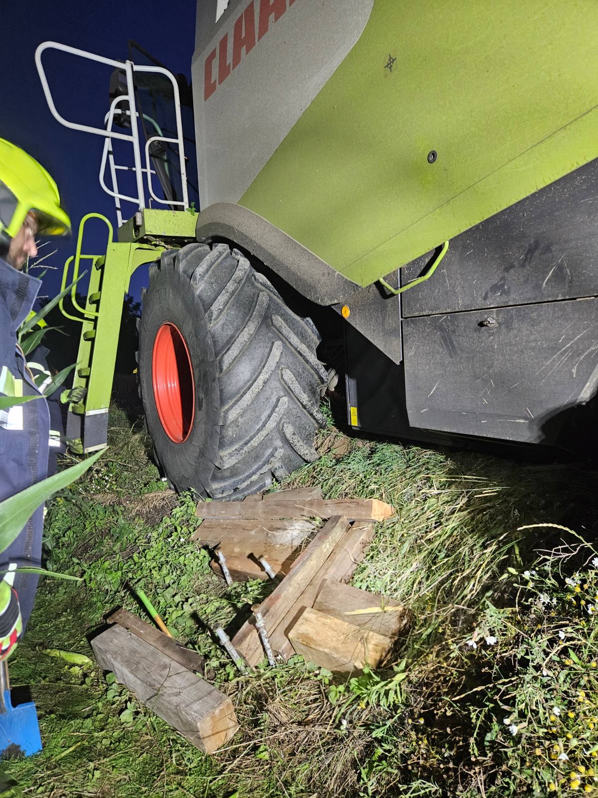 Nach Erkundung der Lage und Absprache mit dem Besitzer wurden zu allererst die Räder mit Pölzholz untergebaut. In weiterer Folge wurde am Heck ein Traktor für den direkten Zug aus dem Graben, an der Front die Seilwinde des RLFA-2000 für die Sicherung angeschlagen. So konnte der Mähdrescher rückwärts aus der misslichen Lage geborgen werden.
