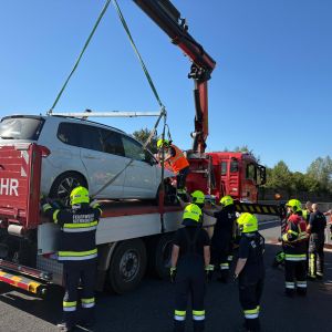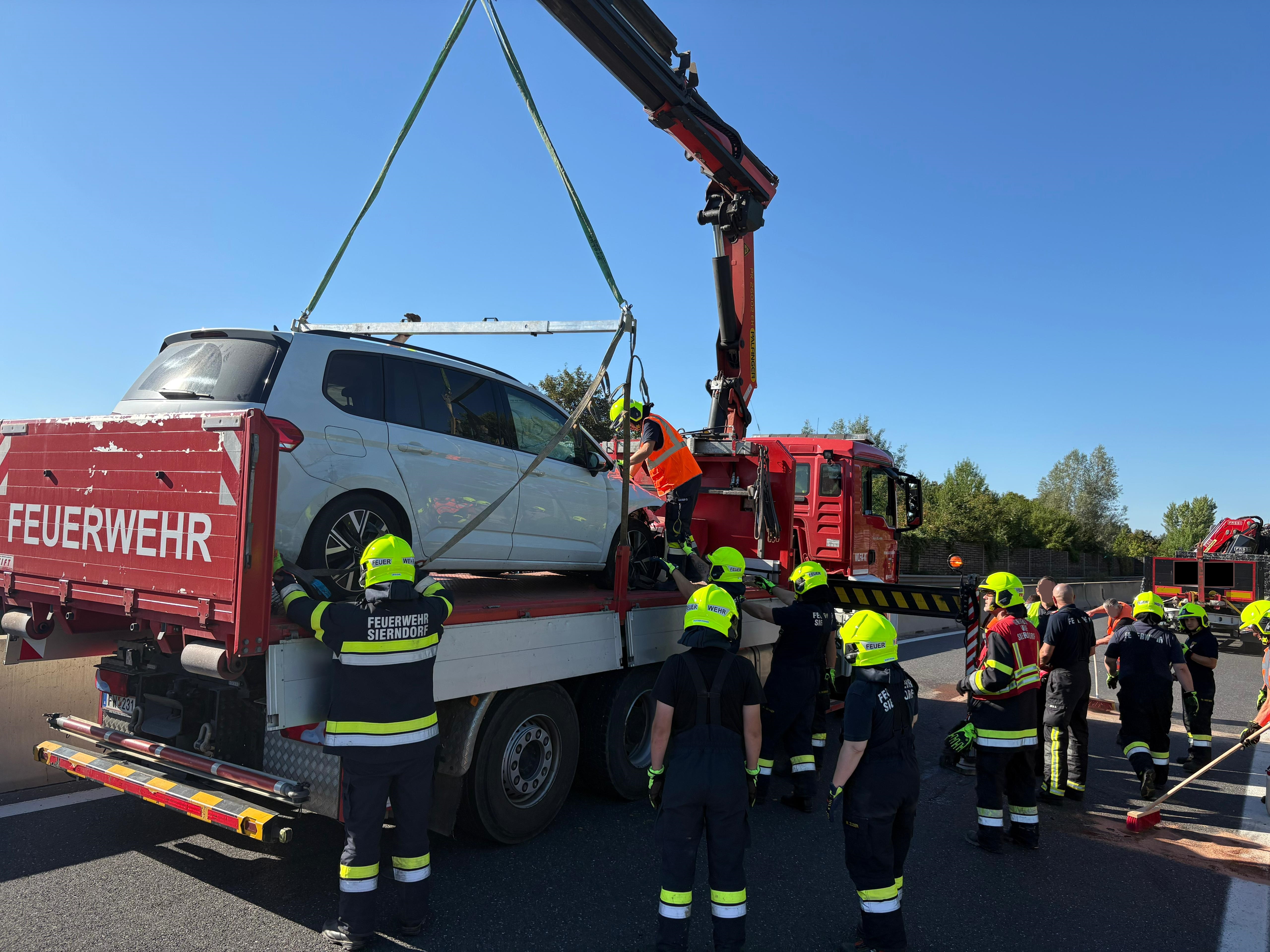 Nach Absicherung der Einsatzstelle und dem Binden von ausgetretenen Flüssigkeiten wurde der PKW mittels Ladekran auf das Abschleppplateau des WLFA-K verladen und abtransportiert.