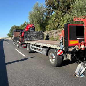 Der LKW-Zug konnte nach provisorischer Befestigung der Stoßstange seine Fahrt fortsetzen.