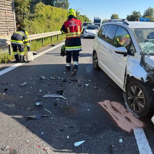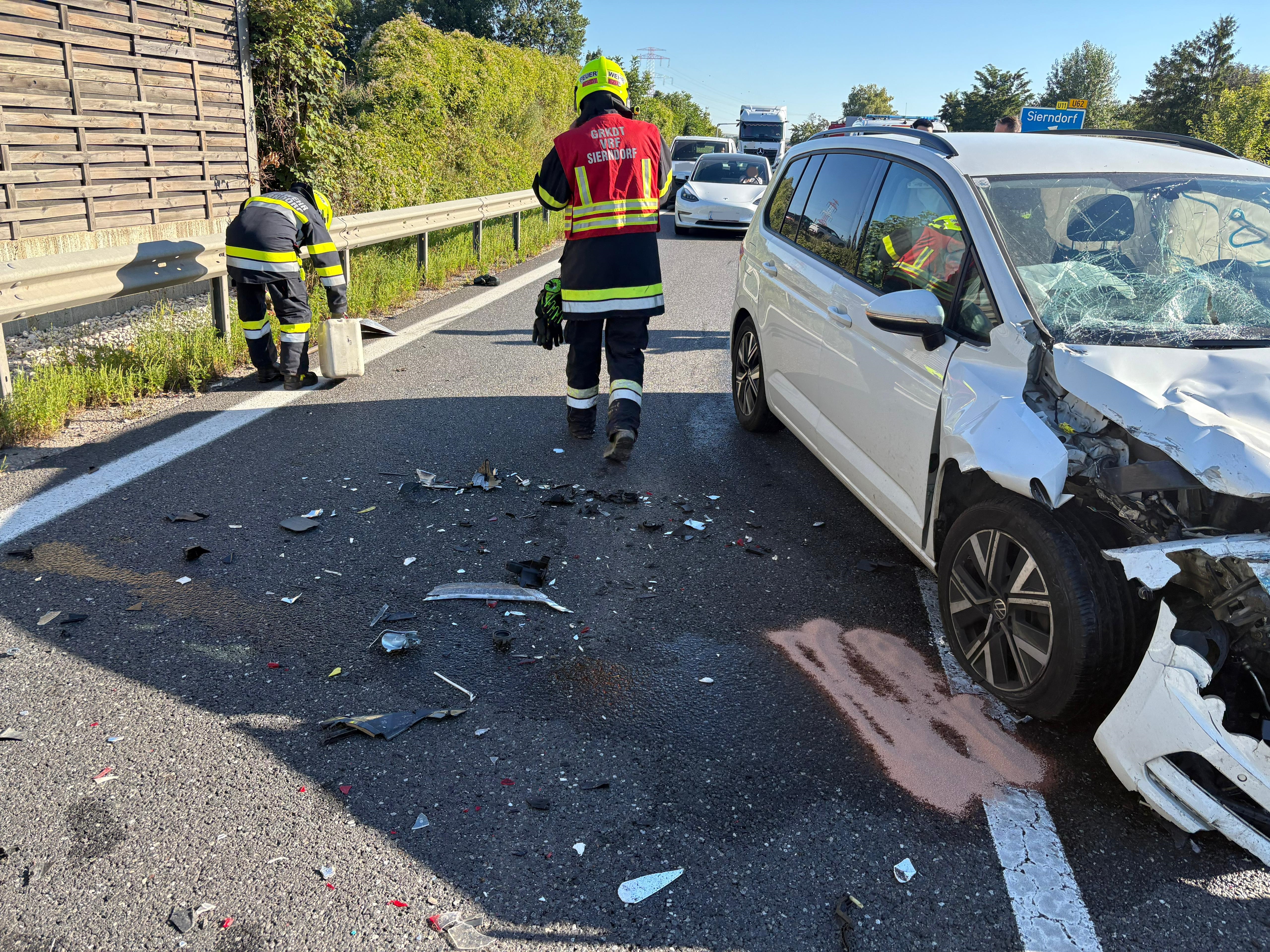 Ein PKW ist auf einen LKW mit Anhänger aufgefahren und kam beschädigt über beide Fahrspuren zum Stillstand.