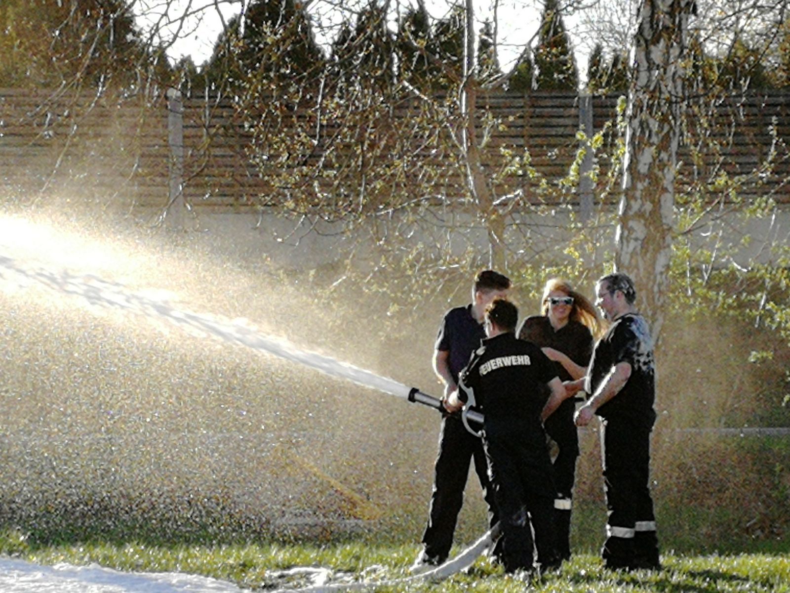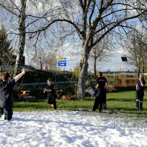 Eine Woche nach dem Wissenstest überlegten wir uns für die Feuerwehrjugendmitglieder eine kleine Überraschung. Nachdem wir alle umgezogen waren, eine Löschleitung vom RLF mit Versorgung durch den Hydranten und die notwendigen Geräte für den Löschangriff mit Schaummittel bereitstanden, wussten bereits alle was passieren würde.