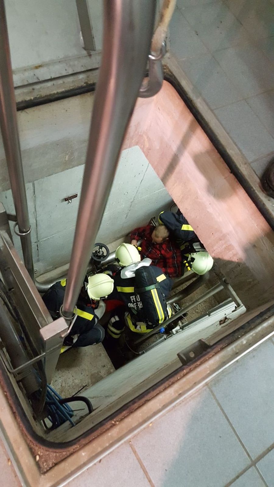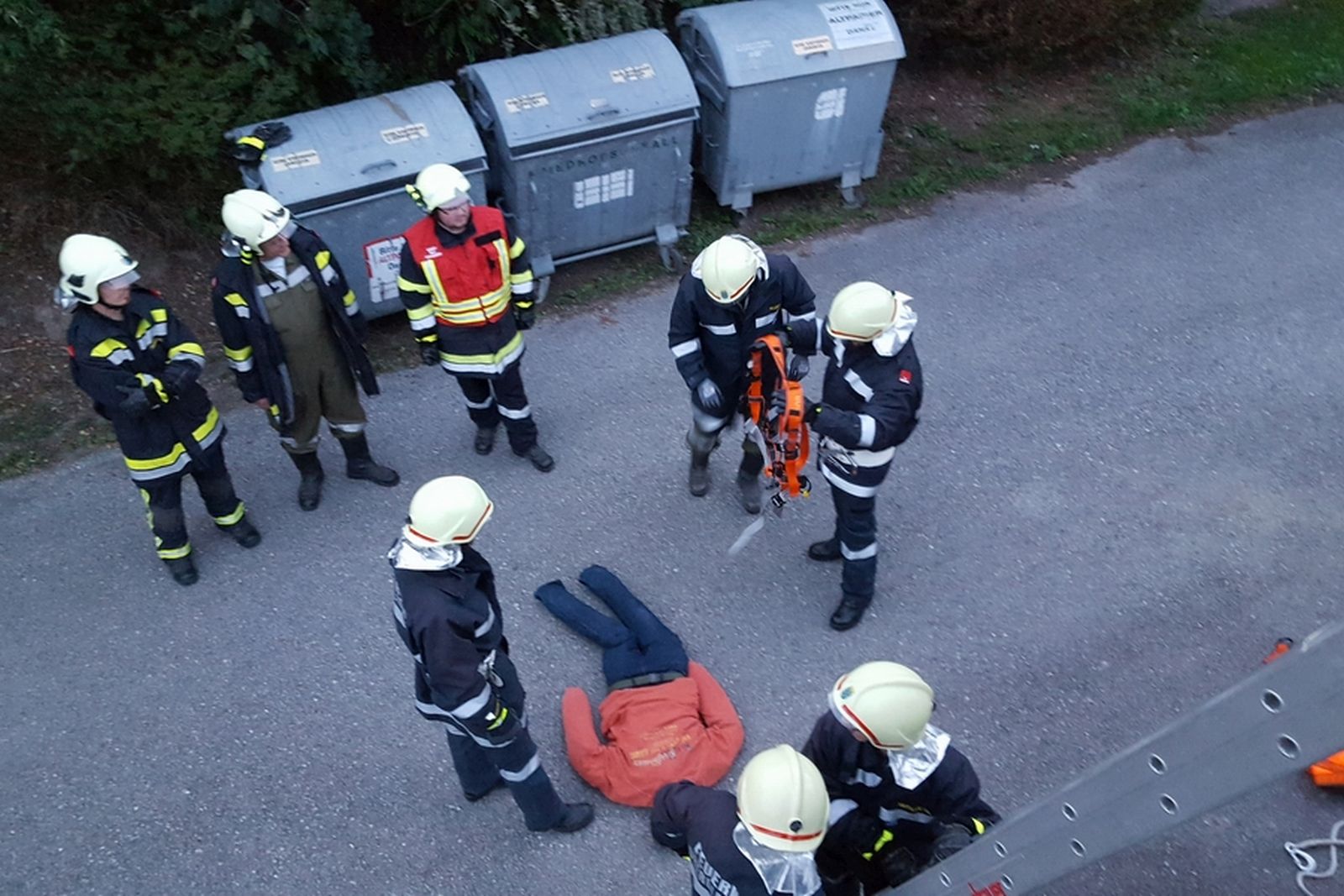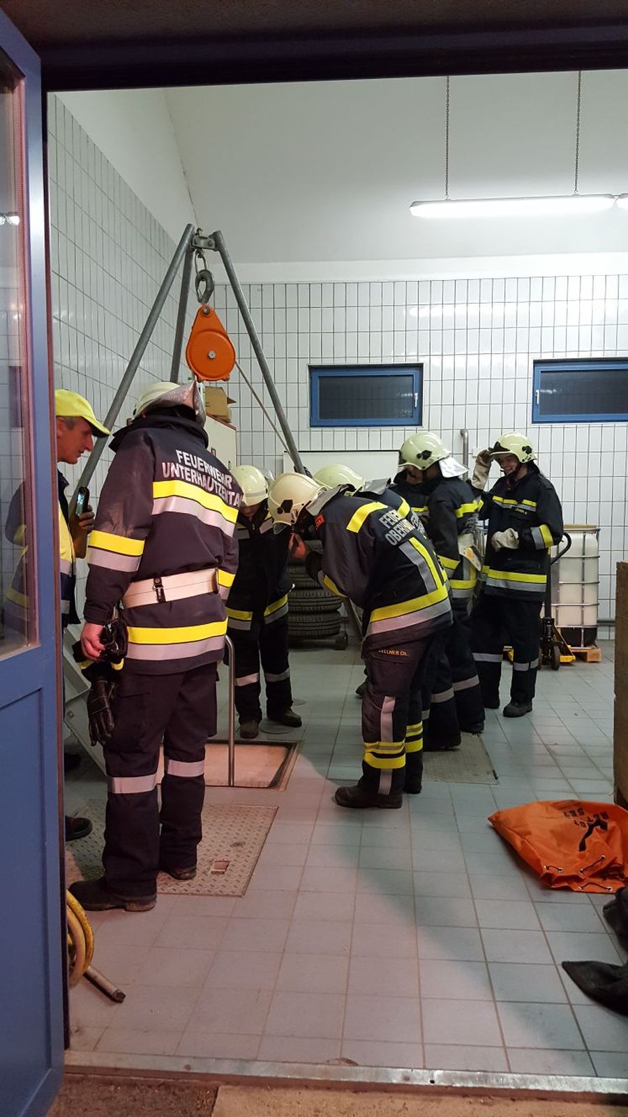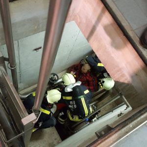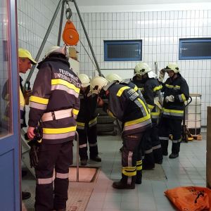 Bei der Übung auf der Kläranlage waren mehrere Stationen vorbereitet. Es galt eine verletzte Person aus dem 1.Stock gesichert mit einem Rettungsgurt über die Schiebeleiter zu retten. Im Keller des Gebäudes galt es eine vermisste Person nach einem Stromausfall zu finden und als drittes Szenario war eine bewußtlose Person aus einem Schacht zu retten.