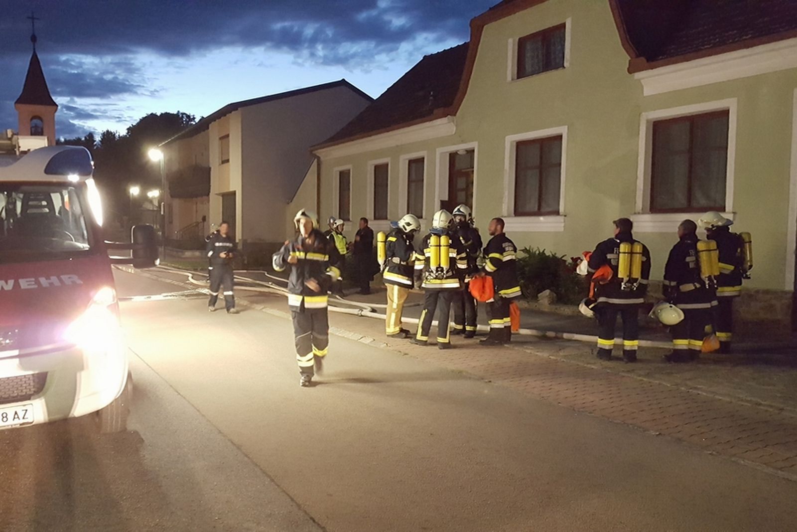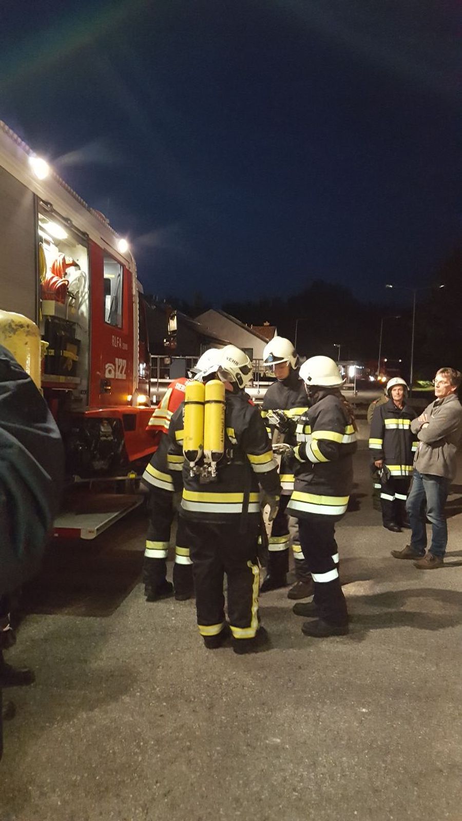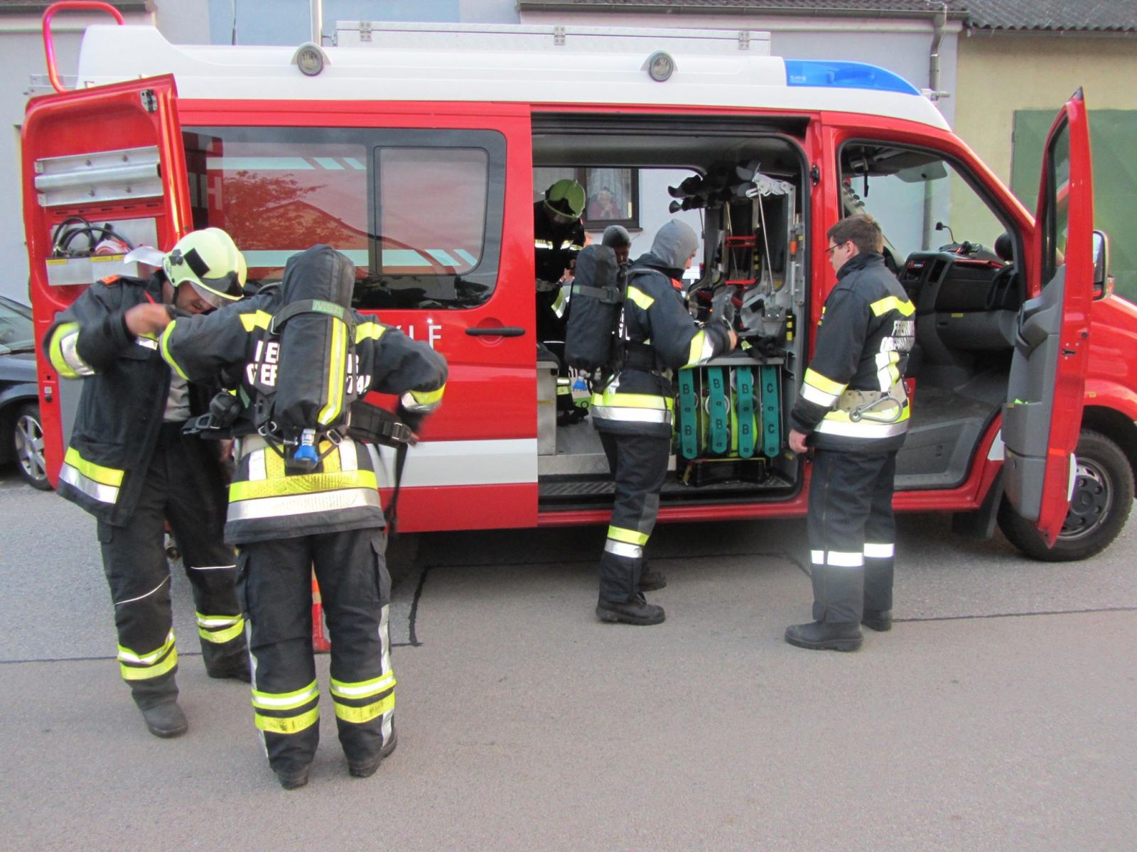 Auch bei der Atemschutzübung in Unterparschenbrunn waren zwei Stationen eingerichtet. Auf der einen Seite war eine vermisste Person aus dem verrauchten Haus zu bringen. Auf der anderen Seite war als Highlight ein Fire-Trainer eingerichtet um einen Zimmerbrand realitätsnah zu simulieren.