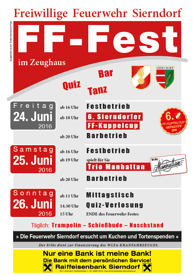 Die Freiwillige Feuerwehr Sierndorf feierte im Jahr 2013 mit der Durchführung der Abschnittsfeuerwehrleistungsbewerbe am 22. Juni und des Abschnittsfeuerwehrtages des Abschnittes Stockerau am 23. Juni ihr 120-jähriges Bestandsjubiläum.